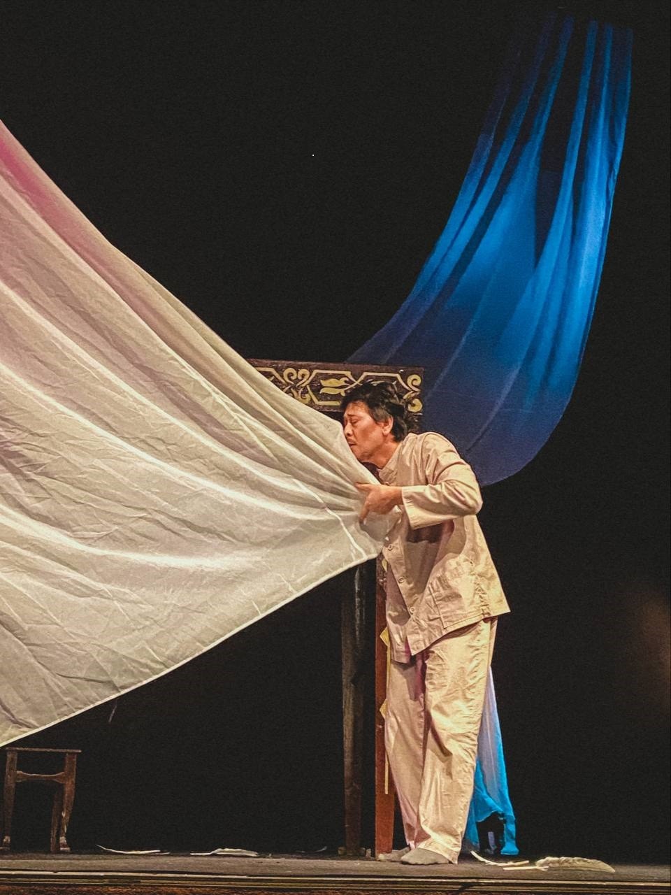 Внутренняя жизнь героя, его иллюзии, восторги и страхи, заблуждения и озарения находят разные формы воплощения в многослойной ткани спектакля.